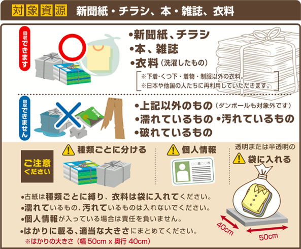 - 古紙は種類ごとに縛り、衣料は袋に入れてください。